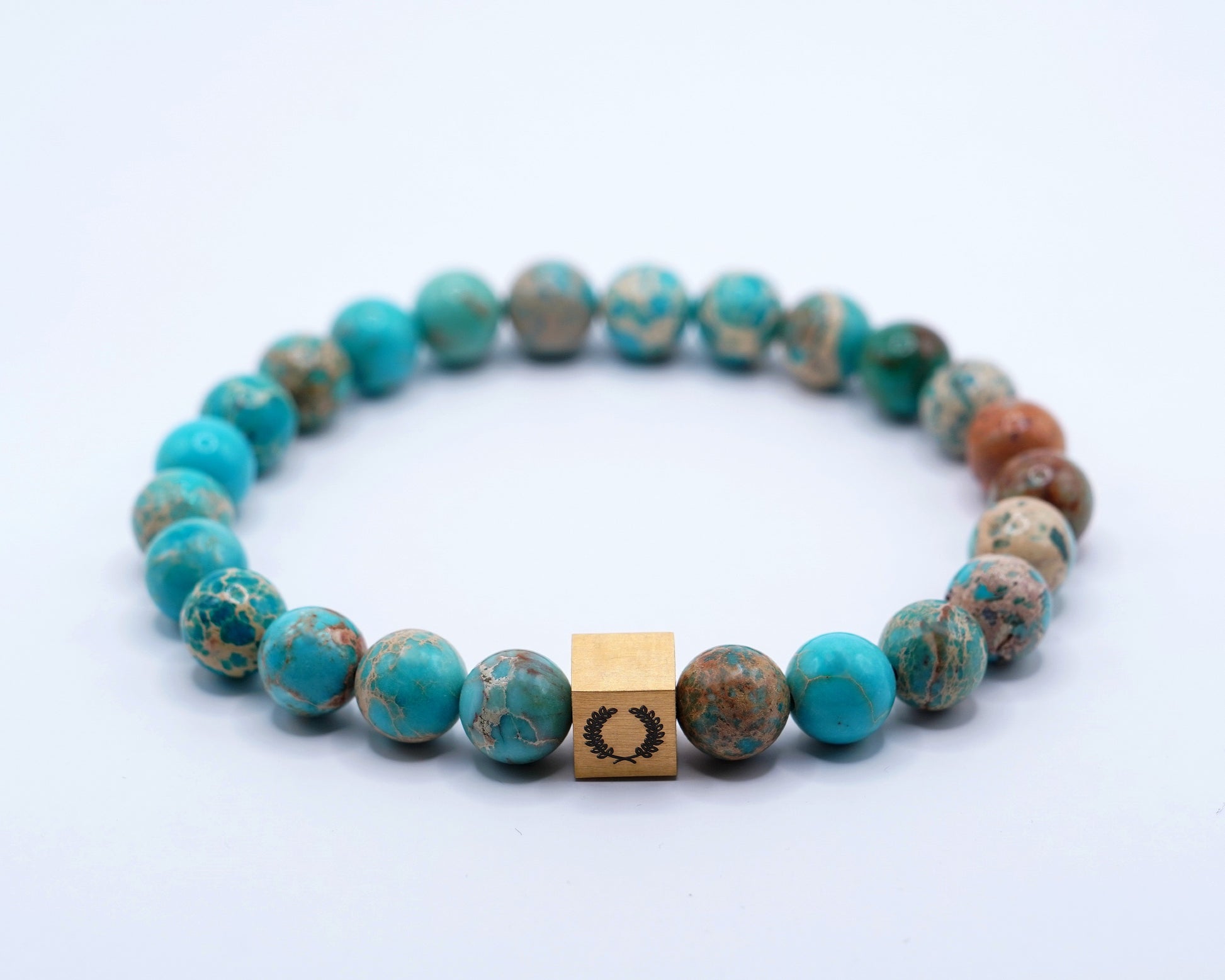 A bracelet where each bead has a unique and striking pattern shifting in shades of turquoise and sandy tones. For a colorful touch
