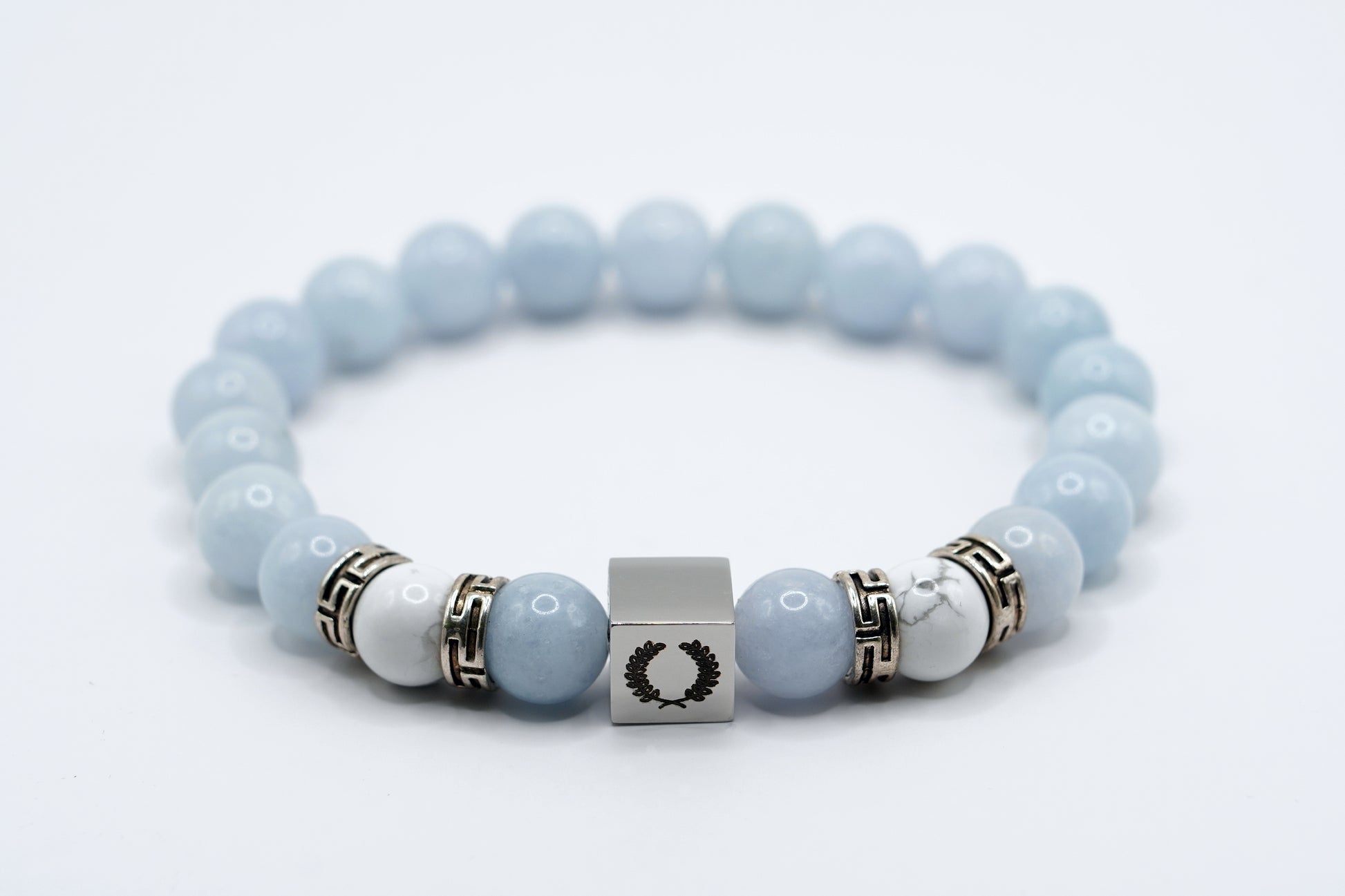 Detta armband i akvamarin kalcedon har en soft ton, den är lätt att matcha och polerade stenarna i ljusblått ger en stilren känsla som gör armbandet både mångsidigt och iögonfallande.