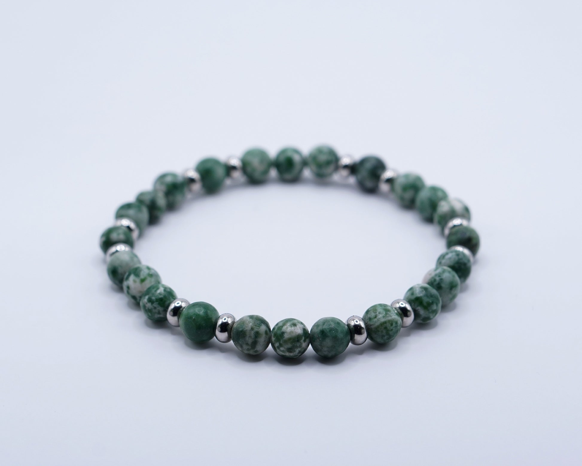 Ljusgrönflammig agat med ljusa toner och ett lugnt uttryck. De rostfria stål detaljerna bryter av och ger armbandet en modern känsla. Enkelt, stilrent och lätt att bära – oavsett tillfälle.