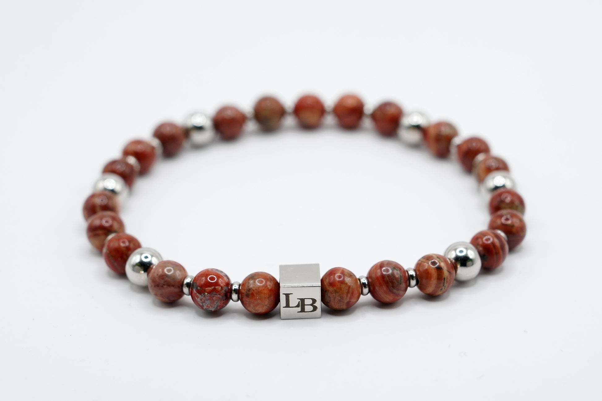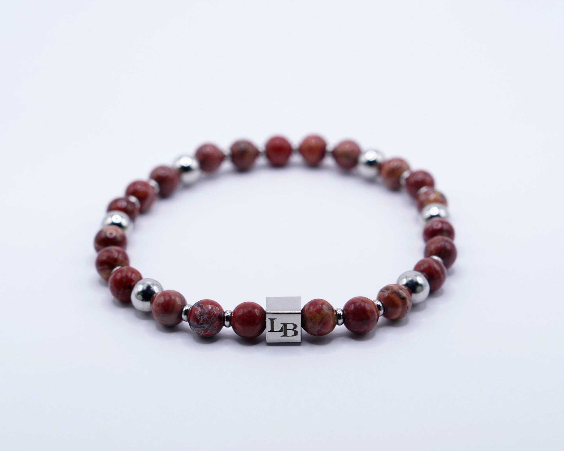 Röd jaspis med naturlig struktur och liv i varje pärla. De rostfria ståldetaljerna ger armbandet en tydlig form och finish. Varmt, stilrent och iögonfallande – ett smycke som håller stilen oavsett sammanhang.
