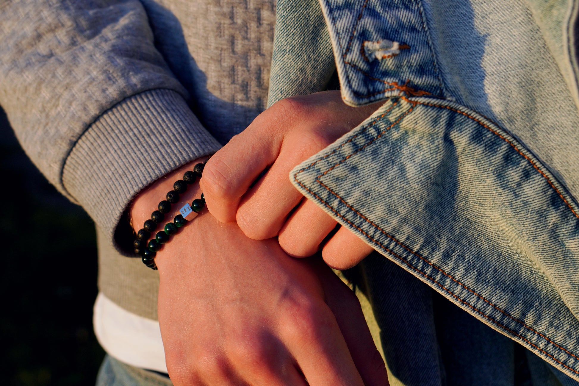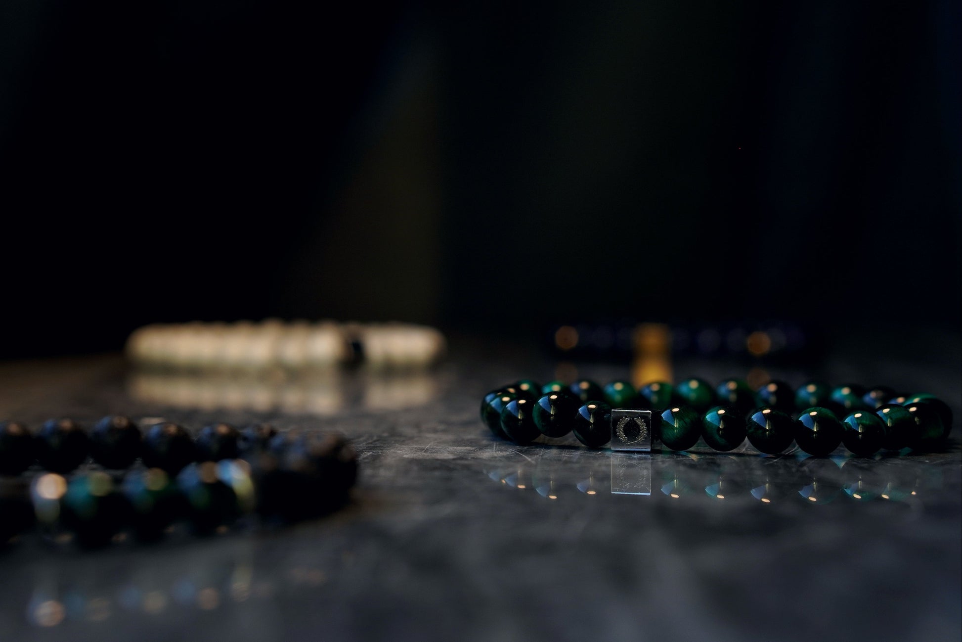 Klassiska smaragdgröna tigeröga pärlor tillsammans med segerkransen. Enkel design, mycket effekt