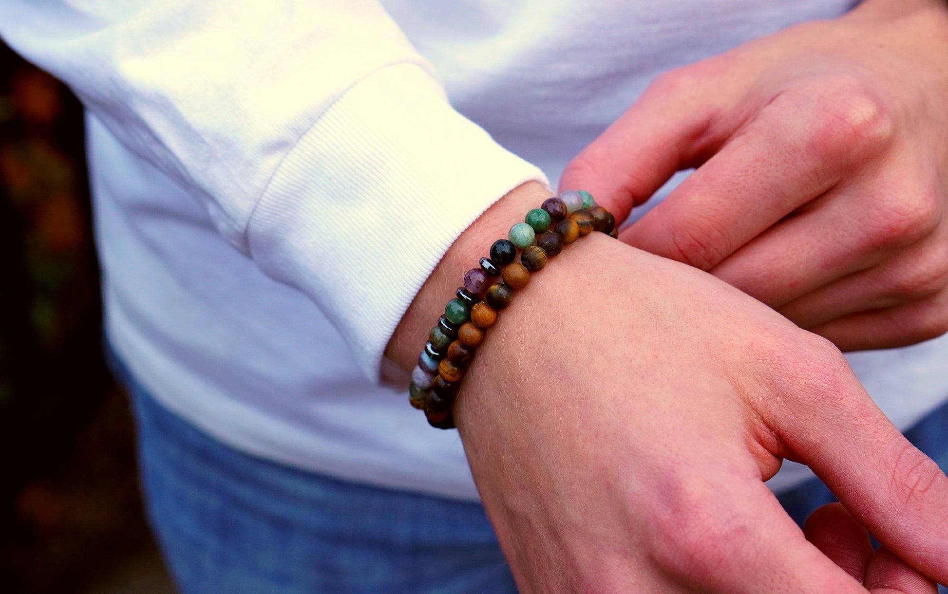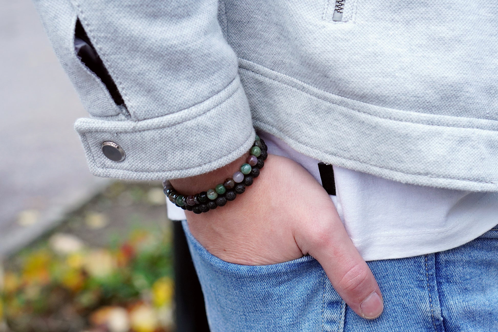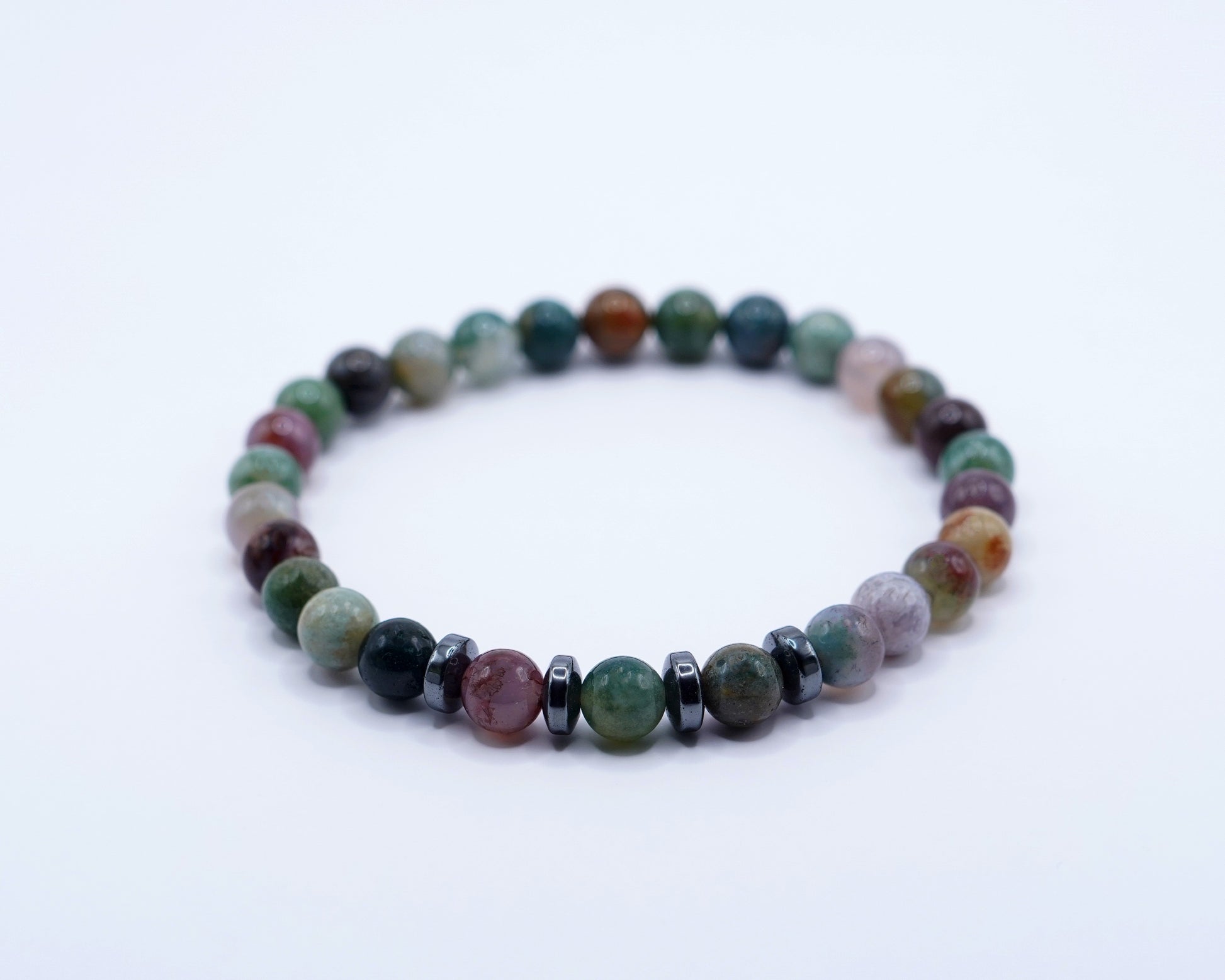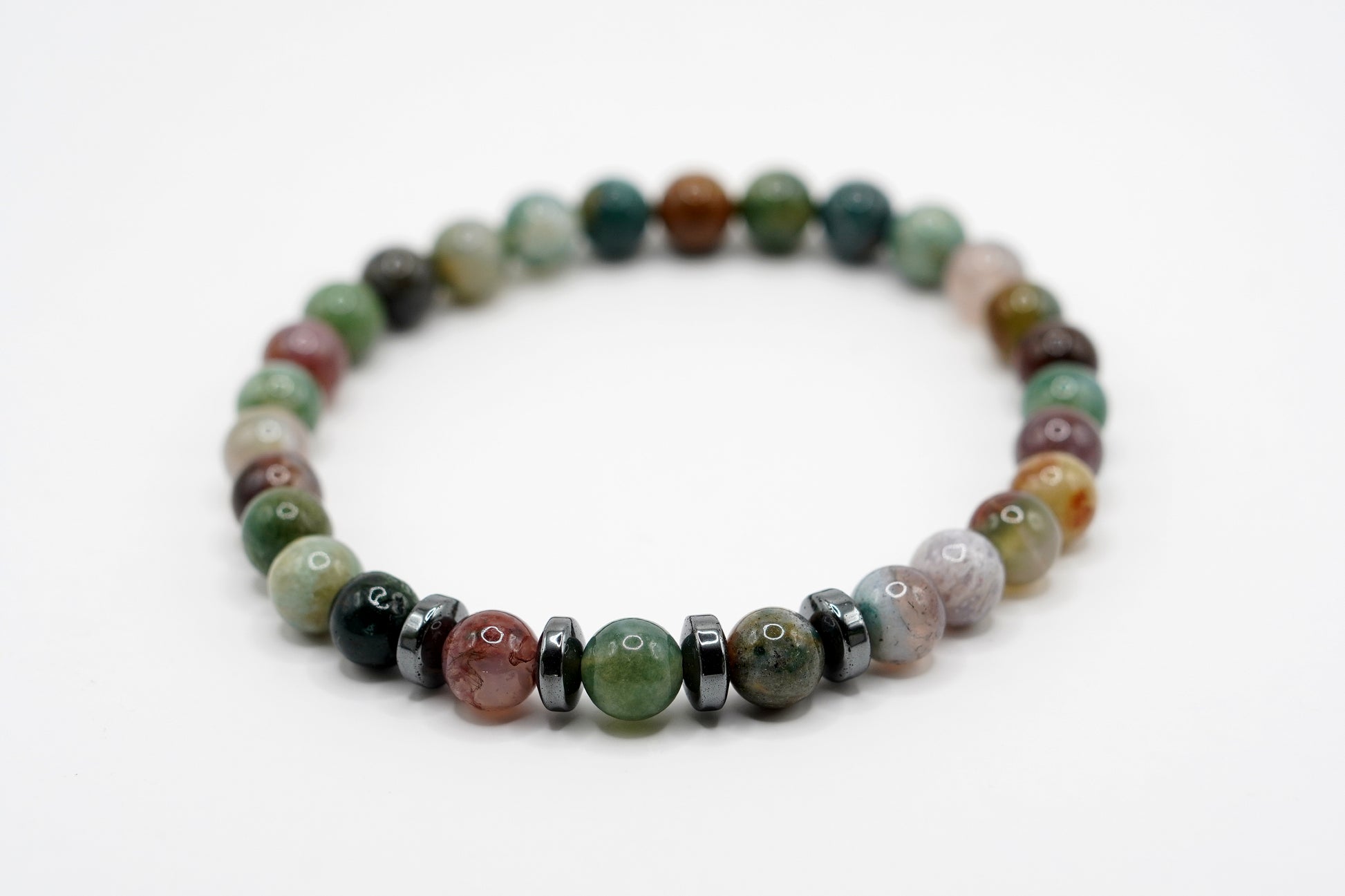 Indisk agat kommer i många vackra nyanserna av jordnära toner, från mjuk blå och grön till djup brun och svart som ger armbandet en bred färgpalett. Enkel mångsidig och elegant.