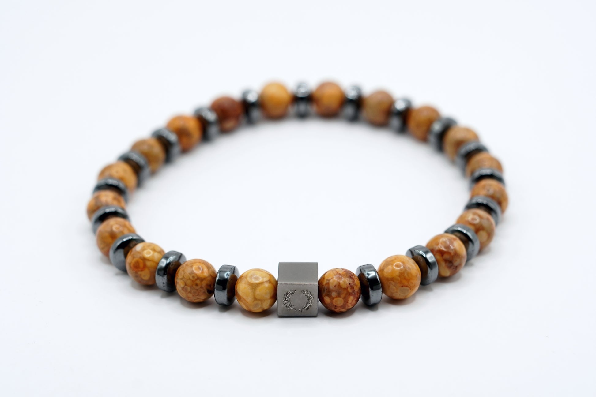 En iögonfallande kombination av mörka, metalliska hematitpärlor och ljusa spräckliga maifanitpärlor som skapar en kontrastfull och elegant design. Perfekt för dig som behöver en statement peice.