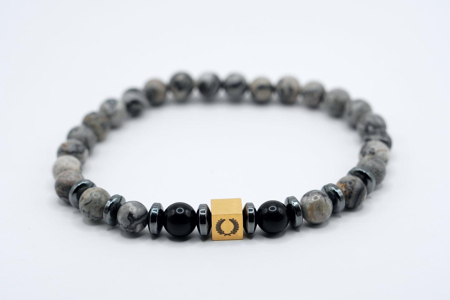 Picasso-jaspis skiftar i flera nyanser av grått, där varje pärla bär sitt eget unika mönster.