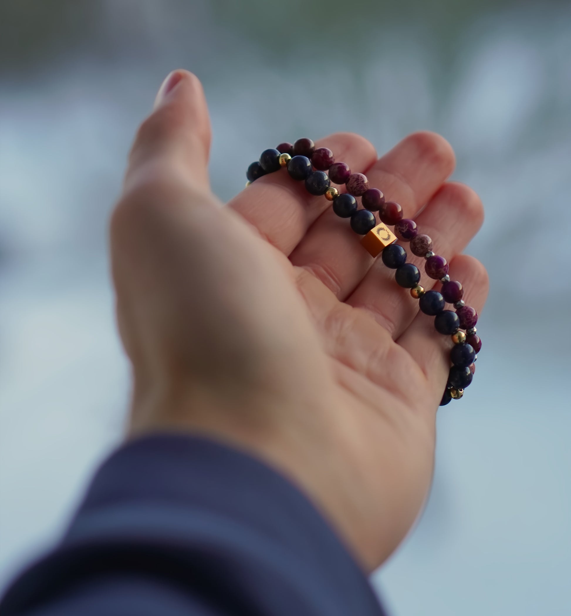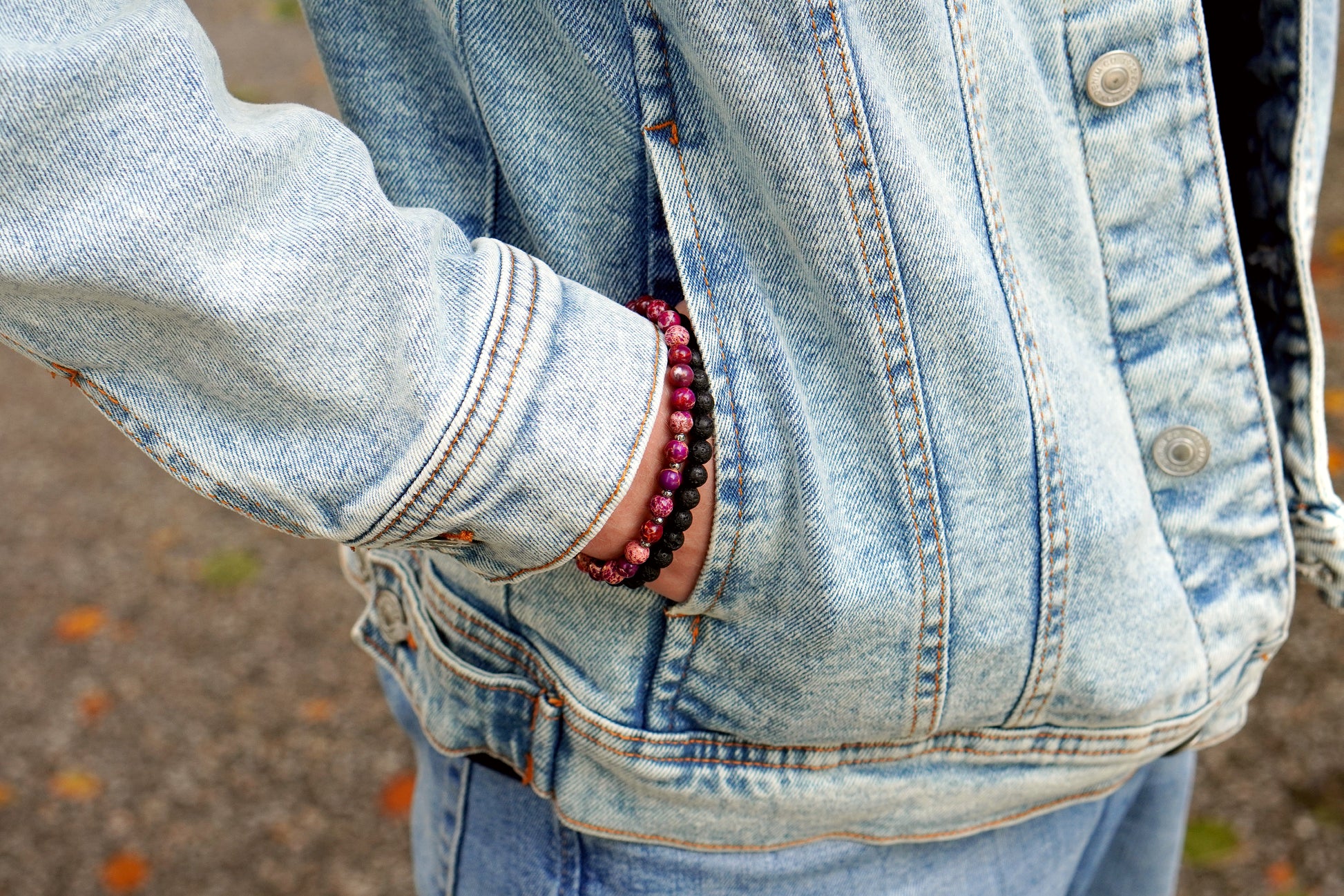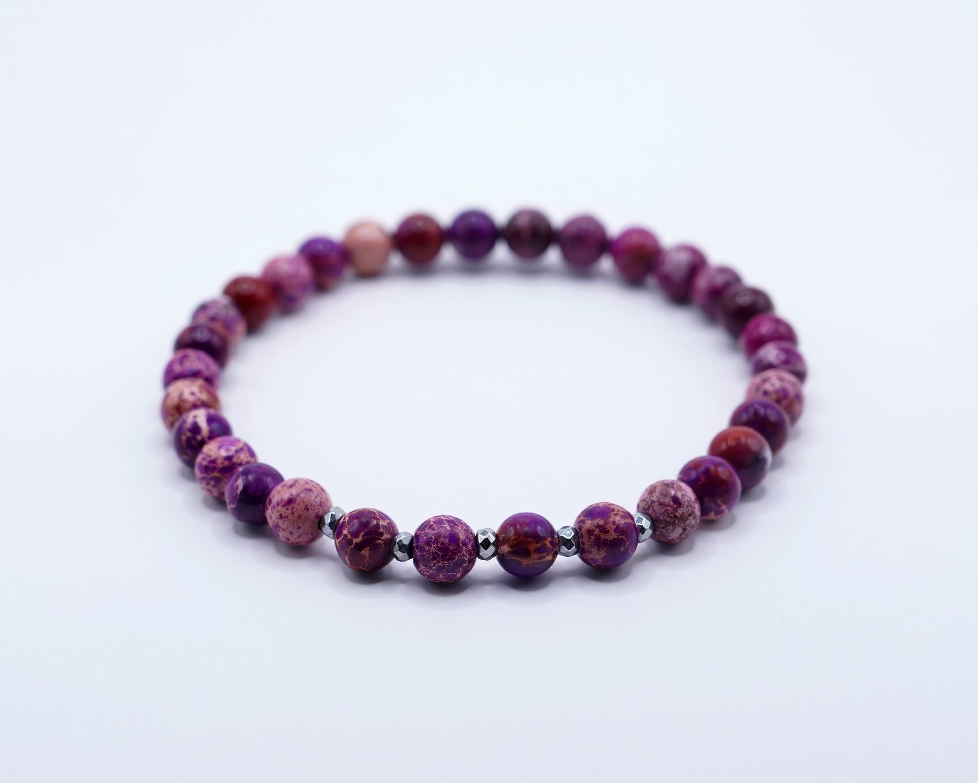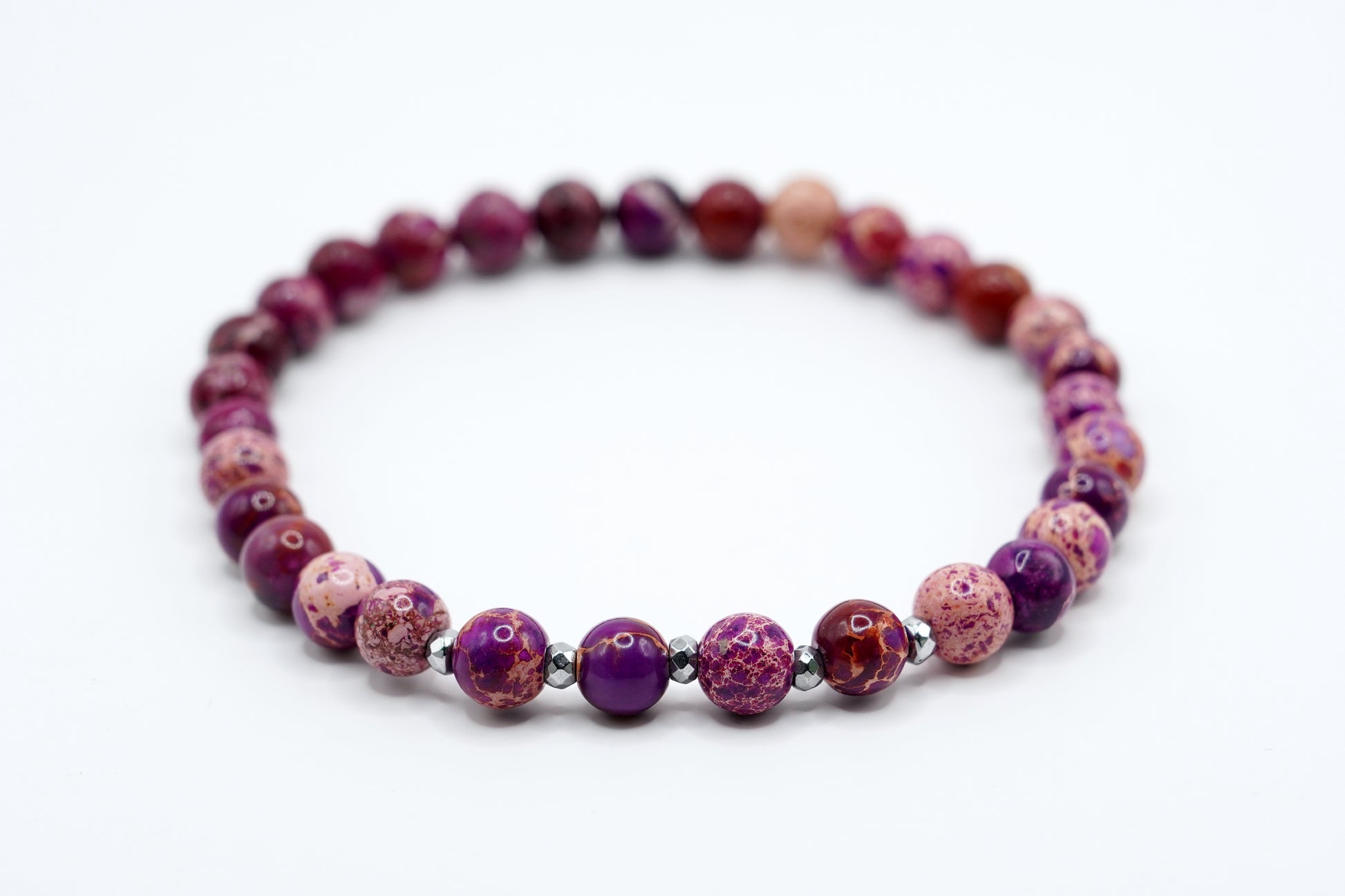 Ett armband av röd-lila flammig jaspis och små metallpärlor. Perfekt för dig som behöver en färgstark detalj till din outfit.