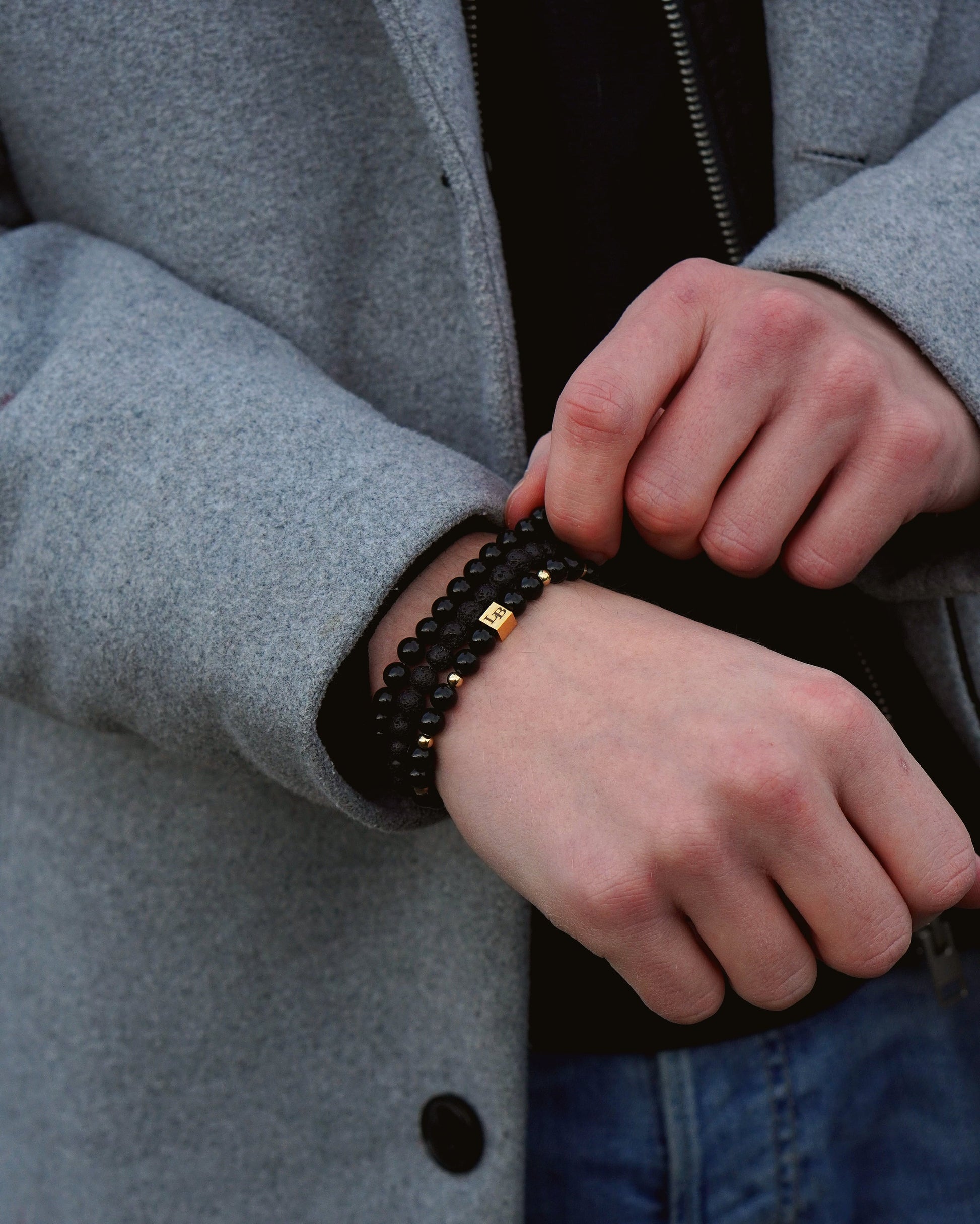 Detta kontrastfulla armband kombinerar den djupa glansen från svart obsidian med den eleganta värmen från de guldfärgade pärlorna, vilket skapar ett stilrent och maskulint uttryck. Ett perfekt val till kostymen.
