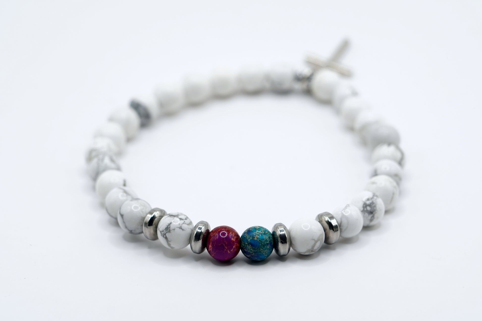 Ett stilrent armband gjord av howlite stenar prydd med rött och blått för en vacker dynamik med korset som sätter pricken över i:et.